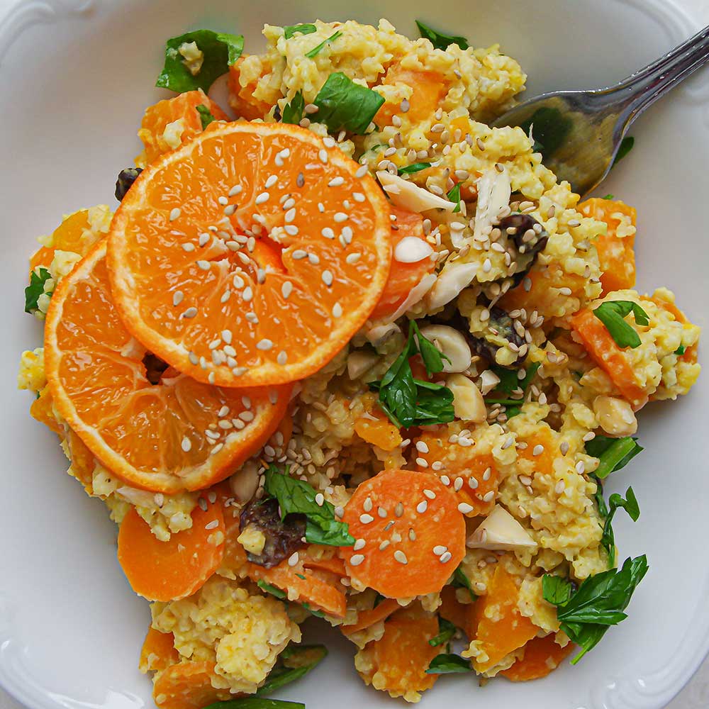 Dieser lauwarme Hirse-Salat mit Kürbis, Karotten, frischer Petersilie, crunchy Mandeln und süßen Rosinen ist ein richtig leckeres und gesundes Wohlfühlessen das durch ein cremiges Dressing auf der Basis von Erdnussmus und fruchtigem Mandarinensaft harmonisch abgerundet wird. Der Salat nährt nicht nur Körper und Psyche, sondern bringt auch Sonnenschein und gute Laune in diese späten Novembertage.
