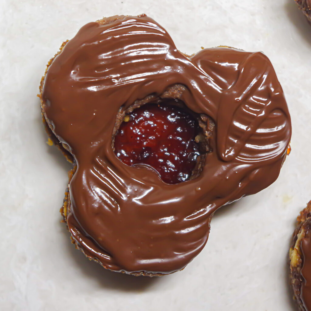 - Die dunkle Kuvertüre im Wasserbad schmelzen lassen und die Kekse dünn damit bestreichen.