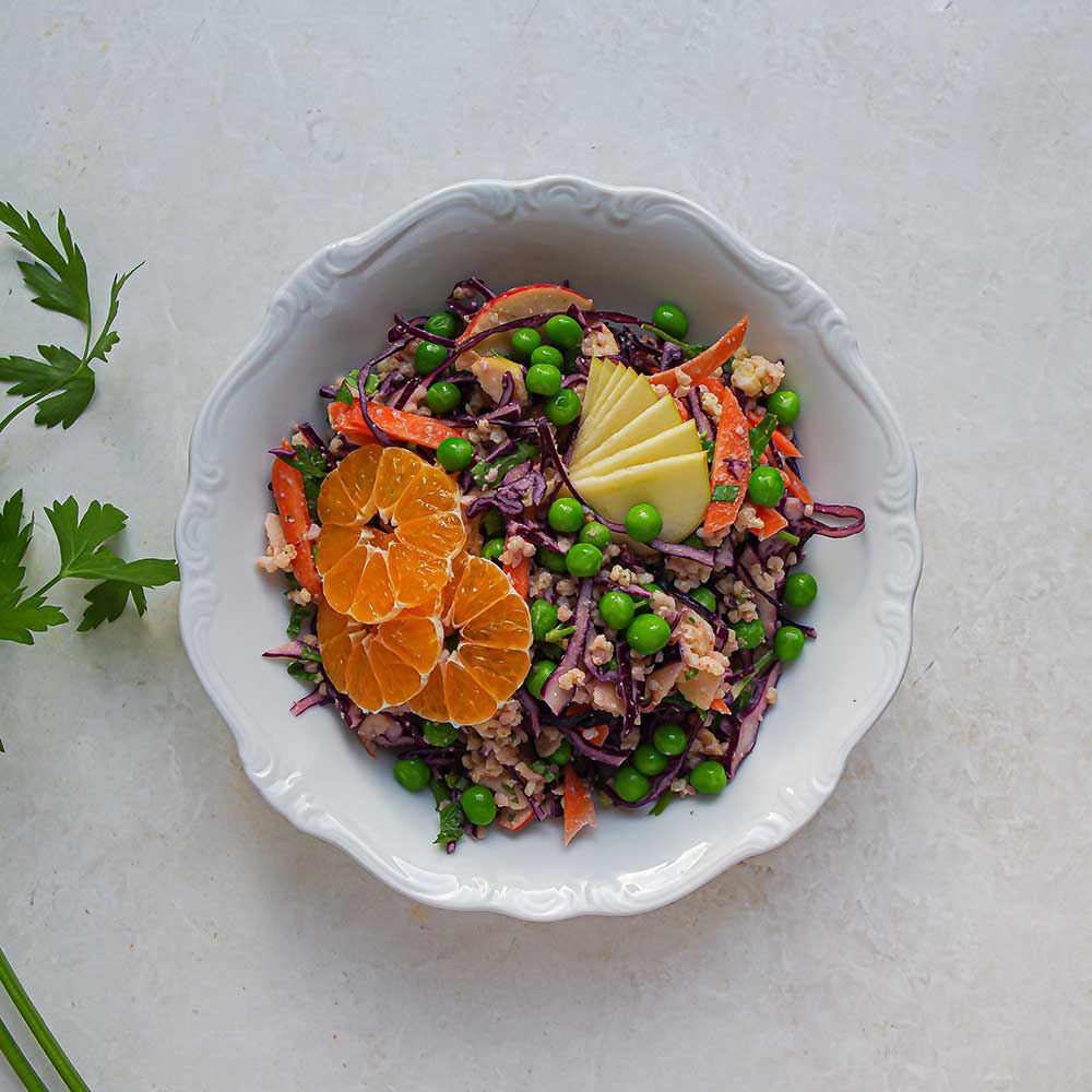Die Basis für diesen Salat bilden Hirse, Rotkraut, Karotte, Apfel und Erbsen. Hirse ist von Natur aus glutenfrei und in etwa so schnell zubereitet wie Reis. Außerdem liefert sie viele pflanzliche Proteine, Eisen und B-Vitamine, die unter anderem ein gesundes Nervensystem unterstützen. Alternativ schmecken Quinoa, Amaranth, Buchweizen, Ebly oder Vollkornreis sehr gut.